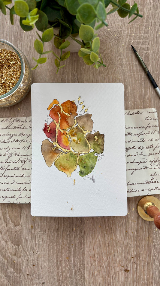Chaque tableau est une pièce originale, où les brisures sont sublimées par l’éclat de la dorure : certaines à la feuille d’or véritable 18 carats, d’autres à la feuille d’or d’imitation, toujours appliquée avec soin pour magnifier l’œuvre.