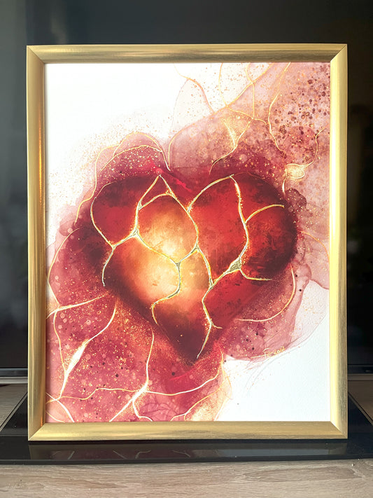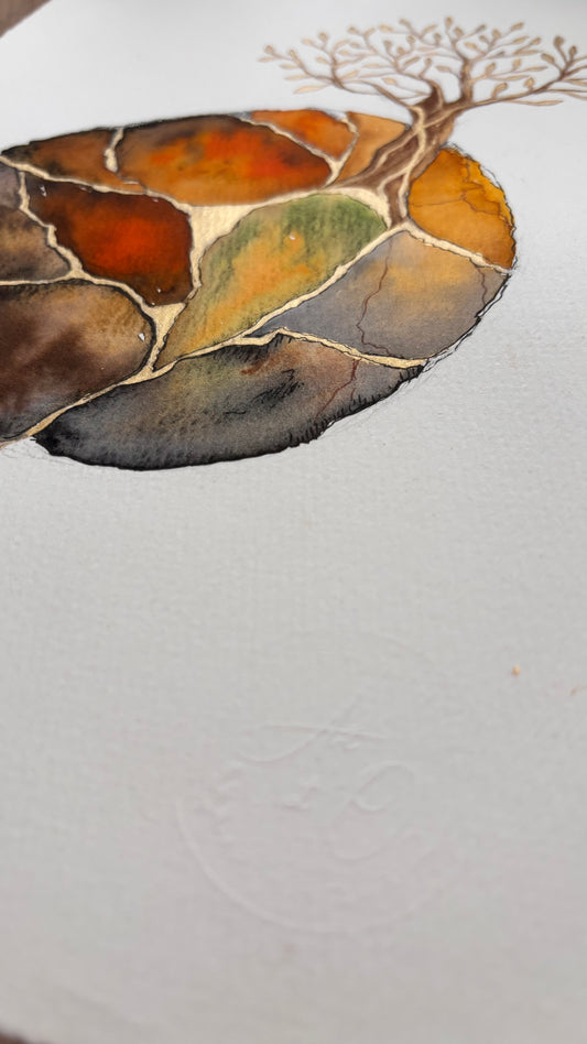 Chaque tableau est une pièce originale, où les brisures sont sublimées par l’éclat de la dorure : certaines à la feuille d’or véritable 18 carats, d’autres à la feuille d’or d’imitation, toujours appliquée avec soin pour magnifier l’œuvre.
