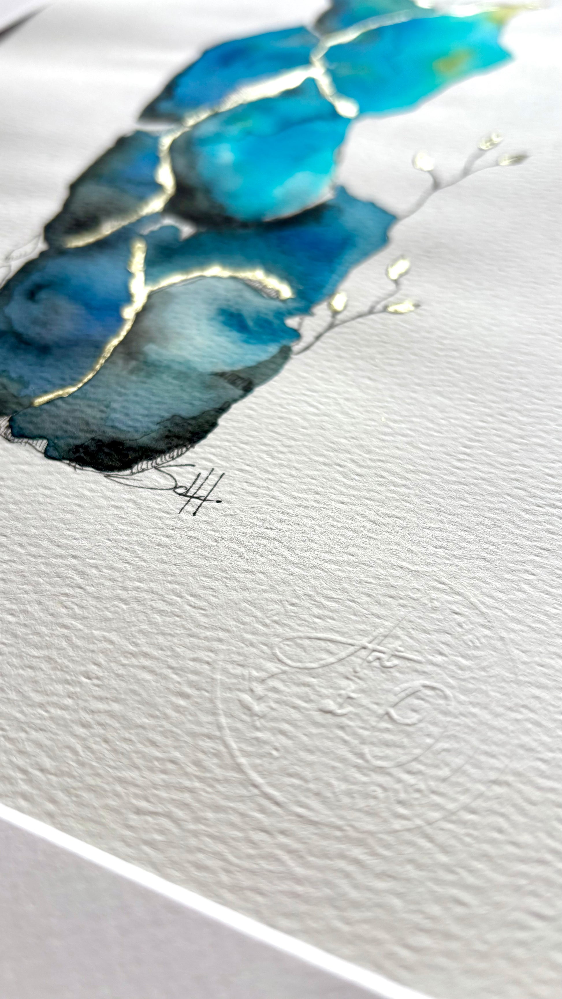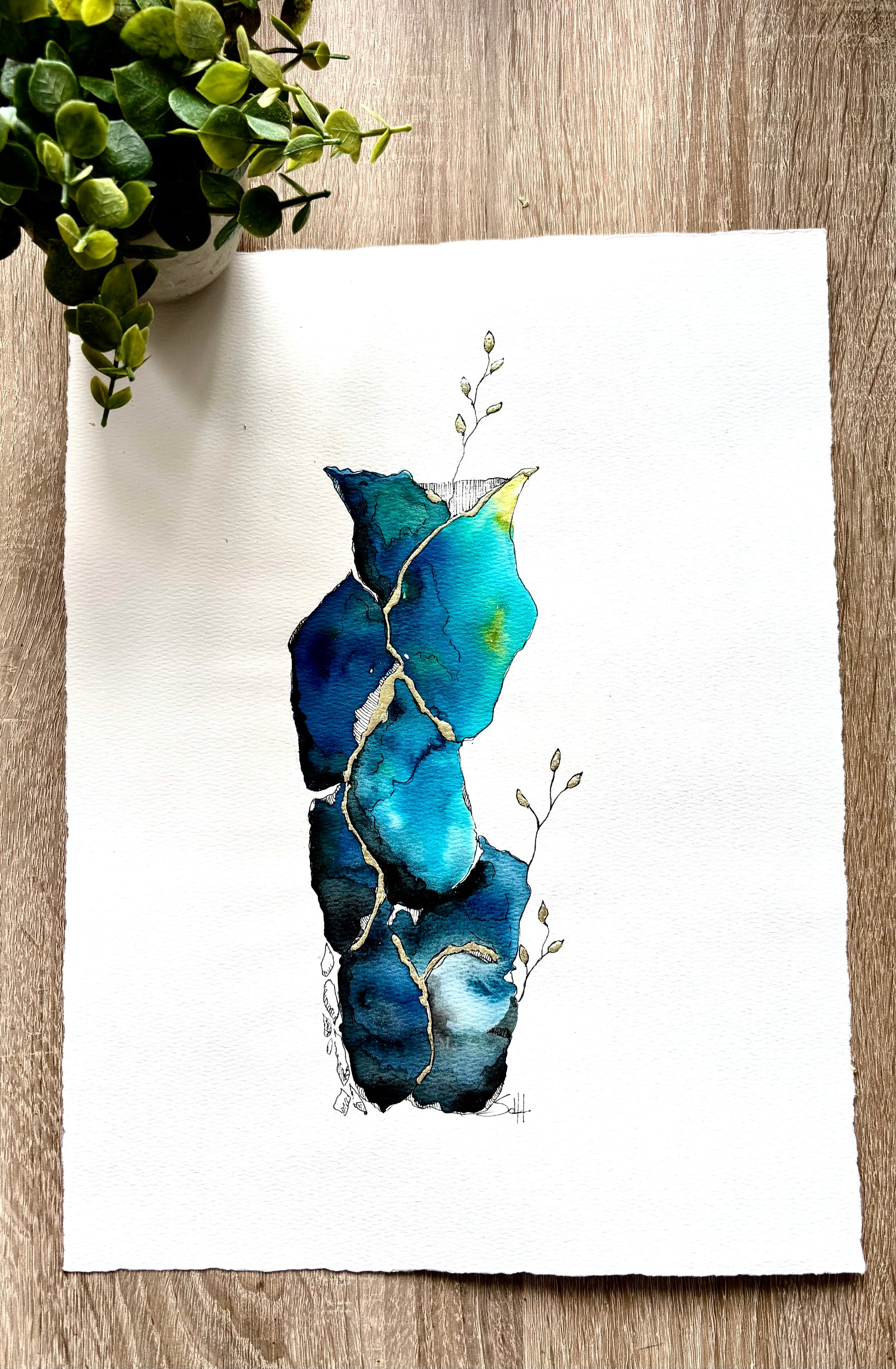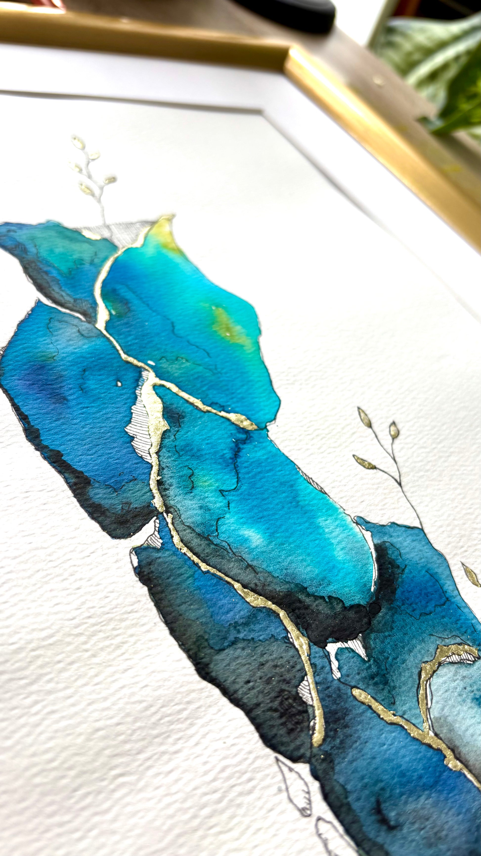 Unique work made by hand, Elevation embodies the beauty of resilience. Inspired by the art of kintsugi, this creation combines watercolor, ink and 18 carat gold leaf to enhance cracks and contrasts. Deep shades of blue and green evoke natural elements, while golden veins and delicate shoots symbolize elevation and rebirth.
