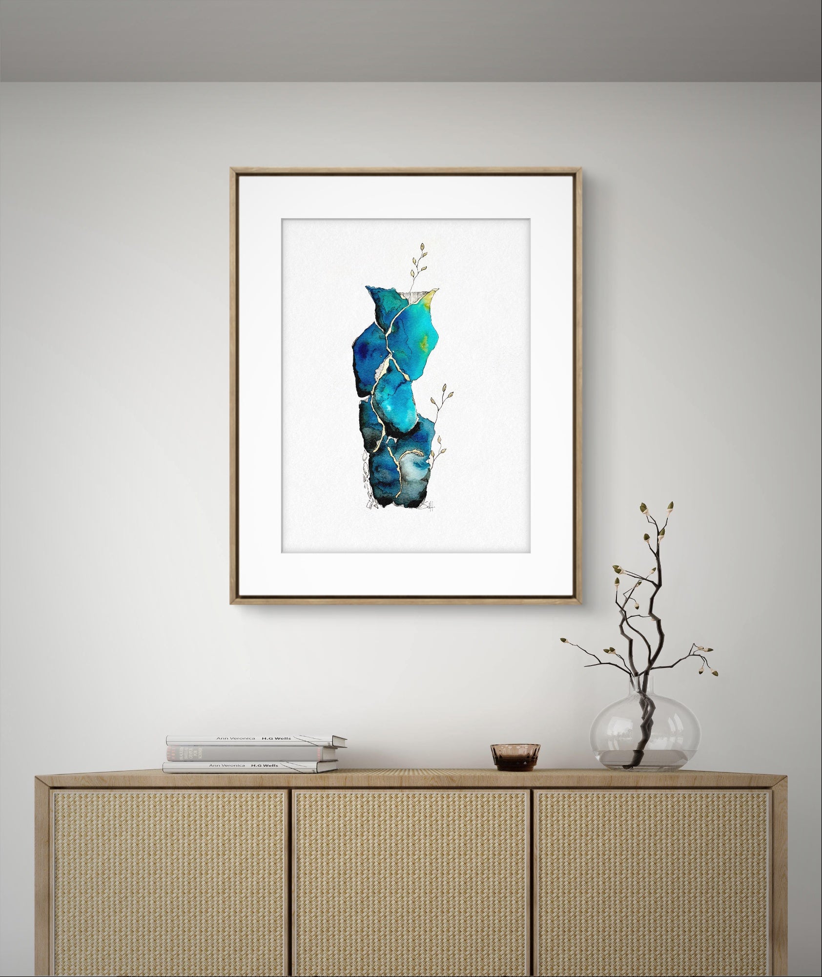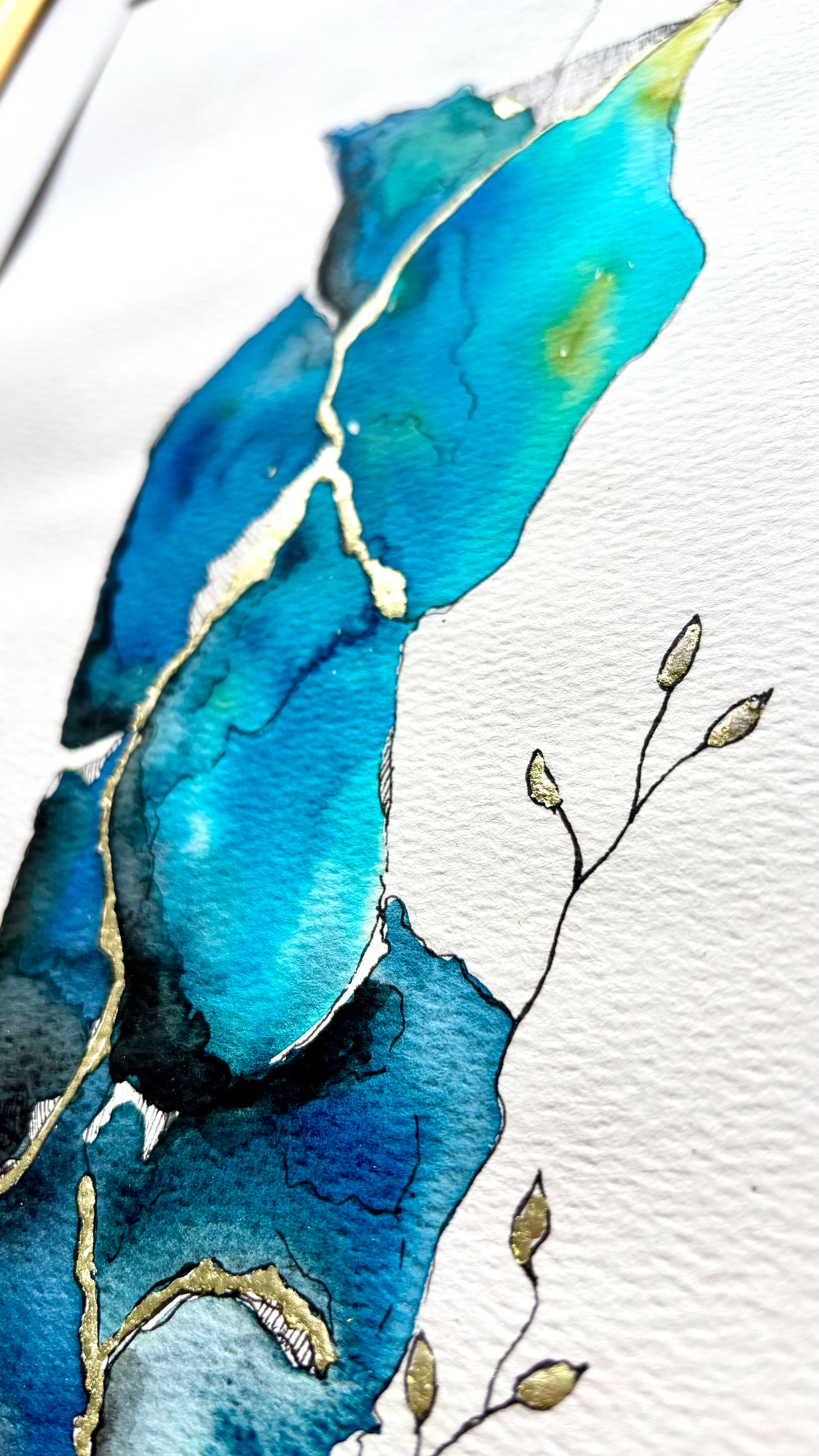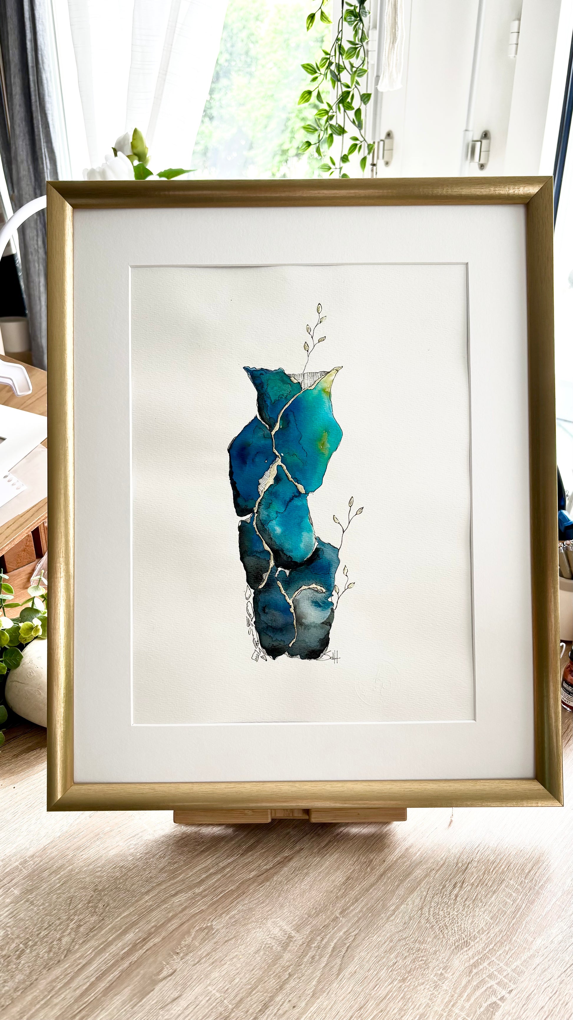 Unique work made by hand, Elevation embodies the beauty of resilience. Inspired by the art of kintsugi, this creation combines watercolor, ink and 18 carat gold leaf to enhance cracks and contrasts. Deep shades of blue and green evoke natural elements, while golden veins and delicate shoots symbolize elevation and rebirth.