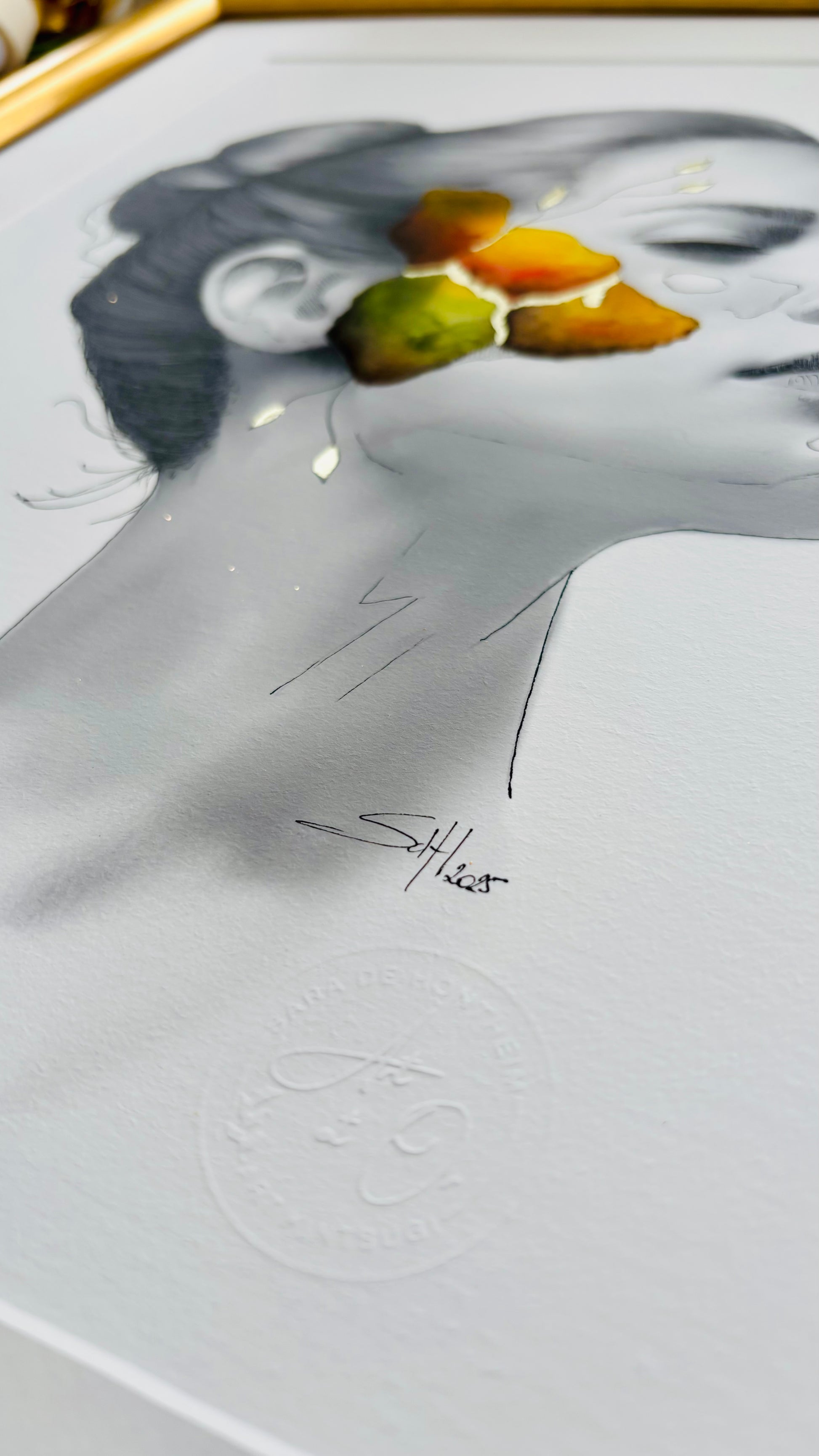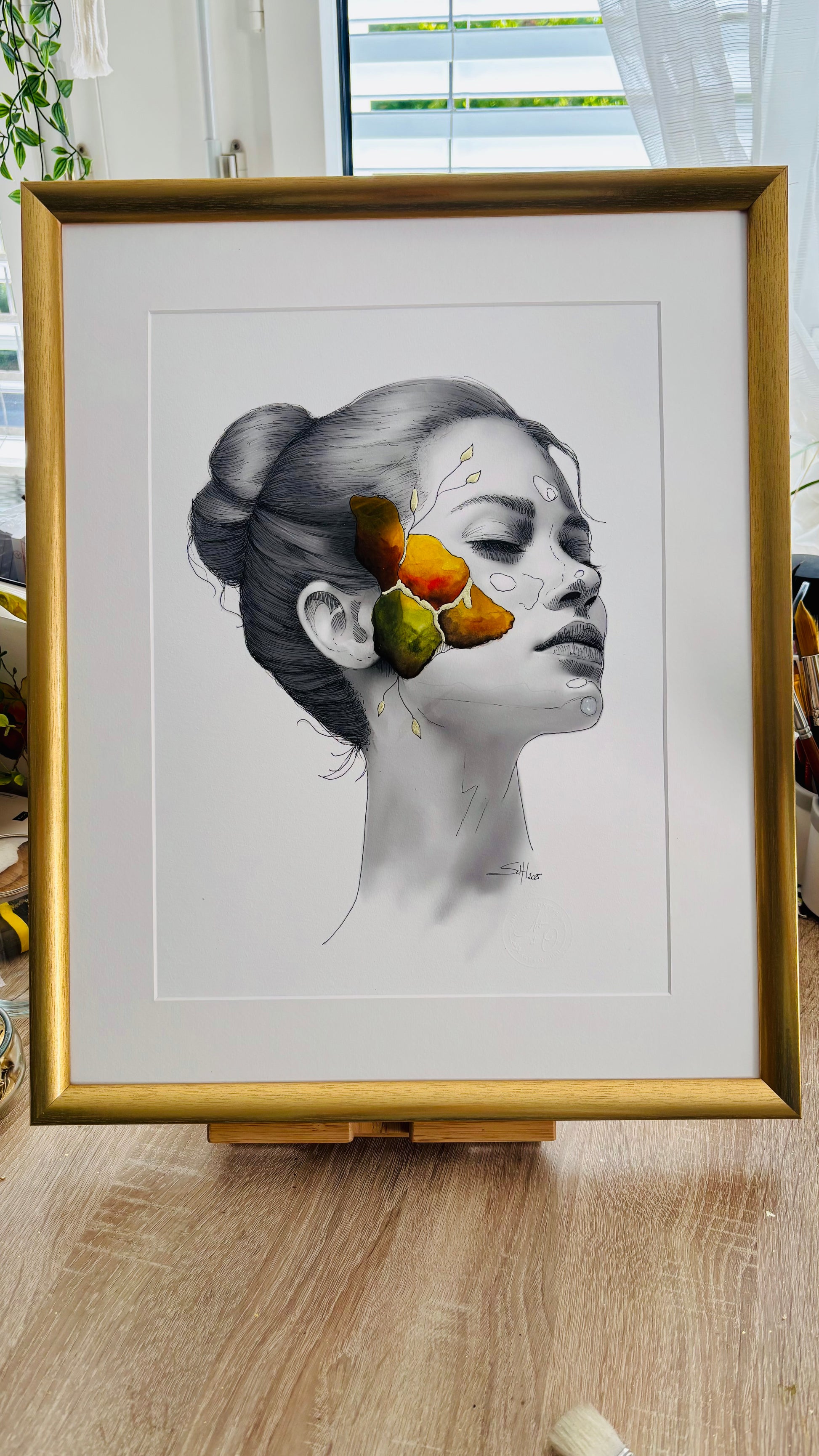 - Framed : The work is carefully attached to a white passepartout to highlight its presentation. The golden frame (40x50 cm) can be changed according to your preferences.