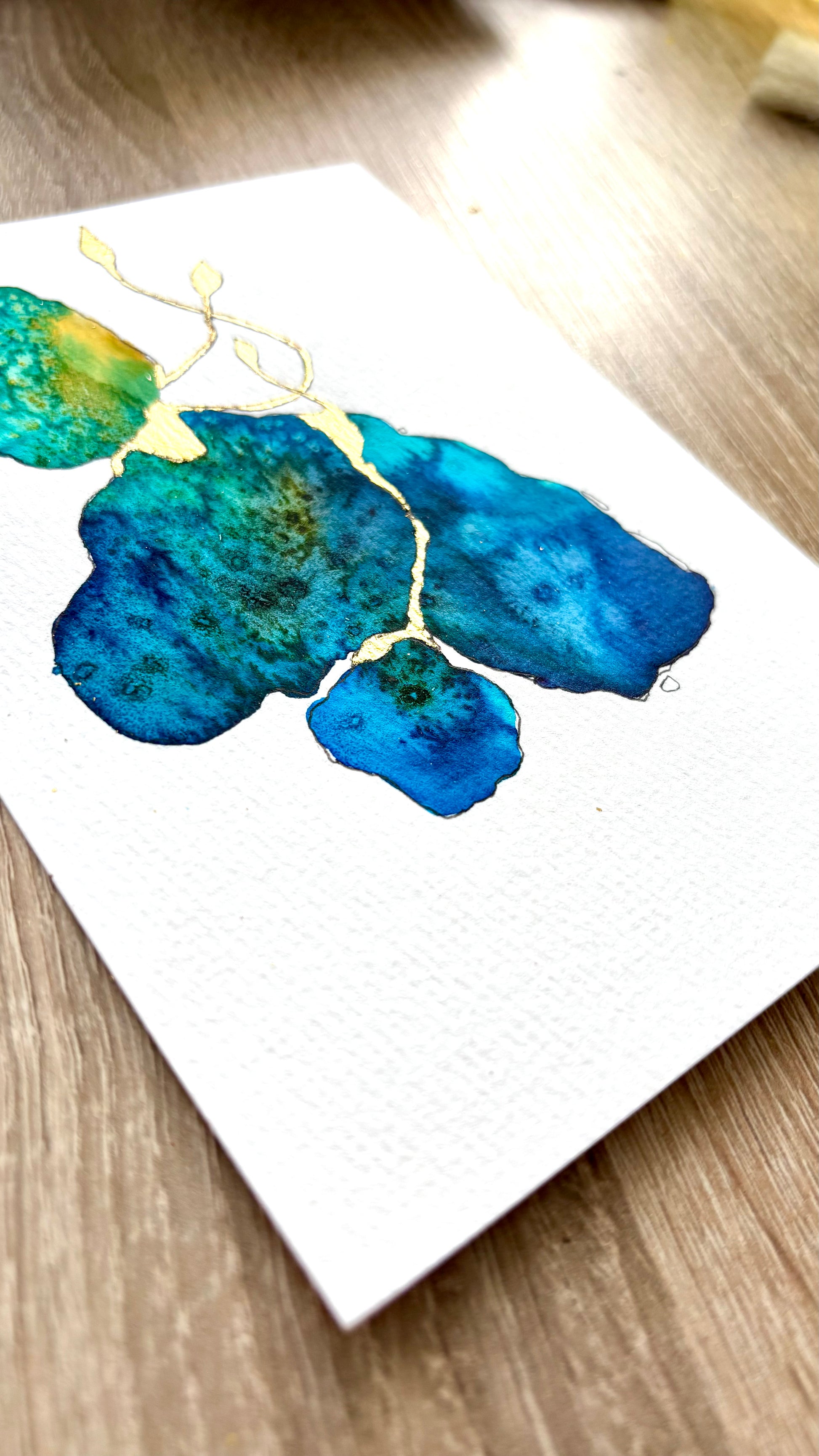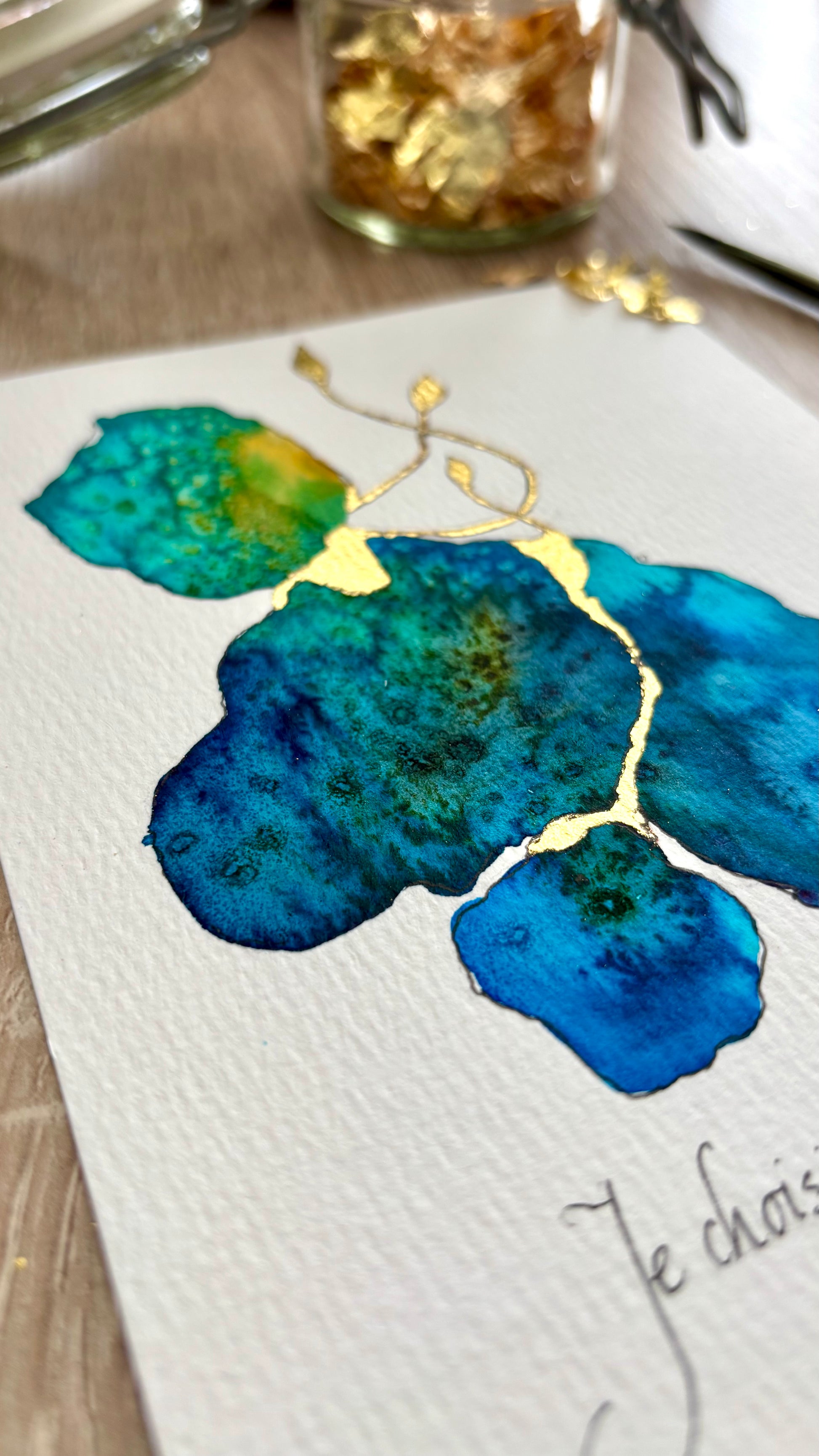 Les bleus profonds rencontrent des touches de vert, comme une sève nouvelle. Les lignes d’or — dorure manuelle — relient les fragments et laissent s’élever des petites pousses dorées.