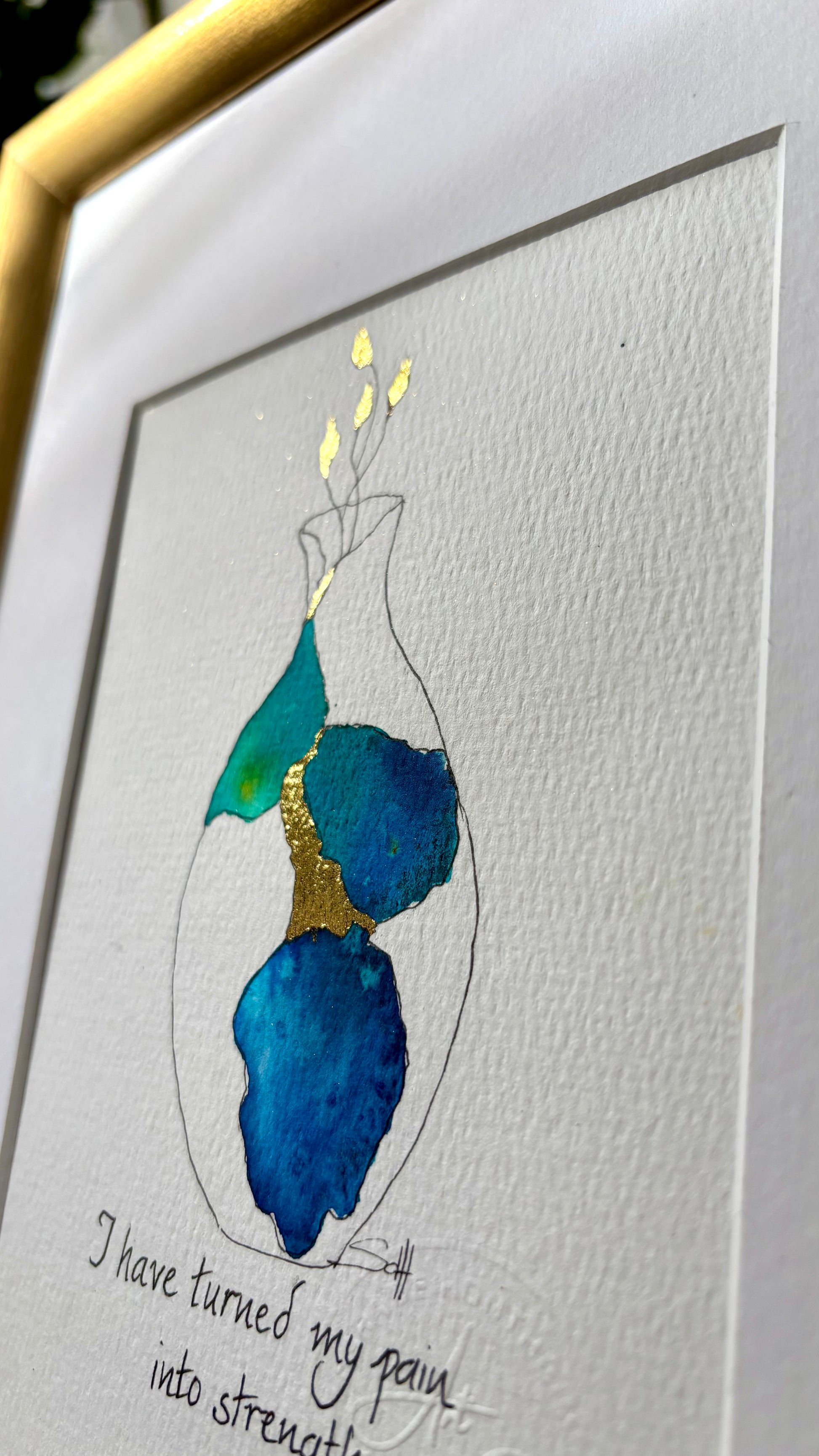 Cette petite œuvre 13×18 cm est une déclaration délicate mais puissante : I have turned my pain into strength.